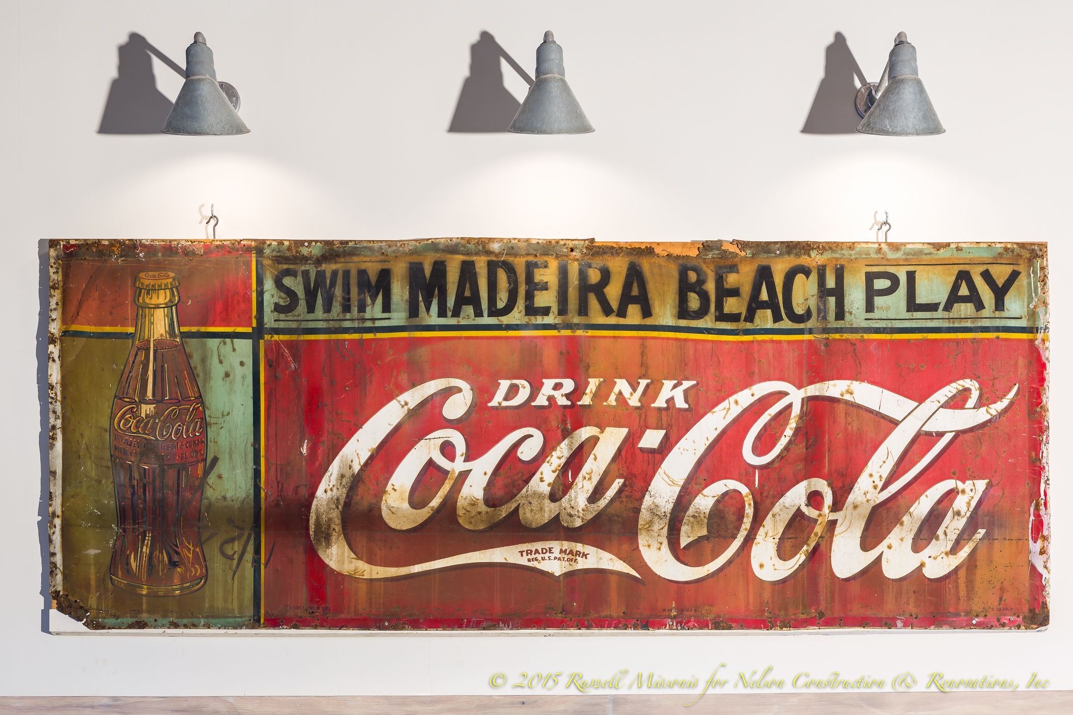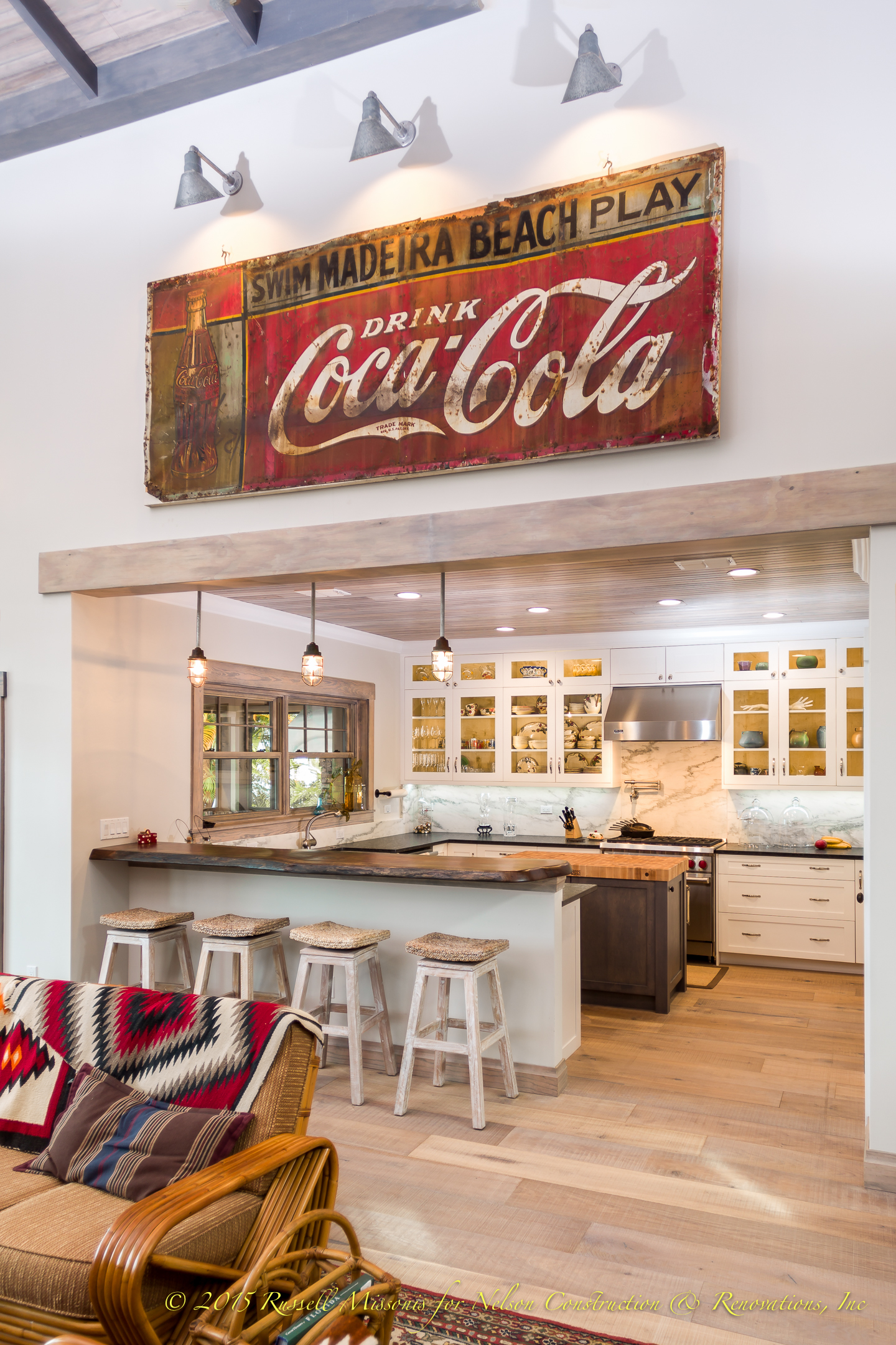 This image shows the beautiful kitchen with the antique Coke sign designed to integrate perfectly.